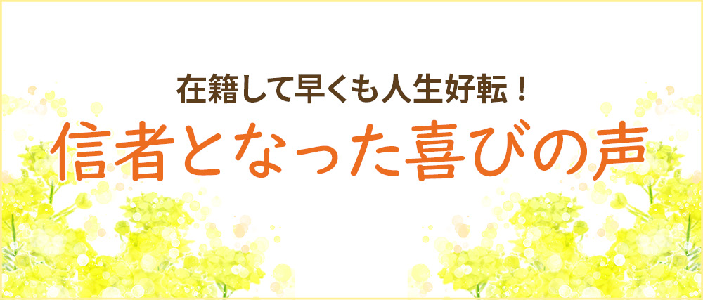 「心が変わる 人生が変わる」 そこに、信者籍の長短は関係ありません。 信者になって、早速奇跡を味わった方の体験談をご覧ください。