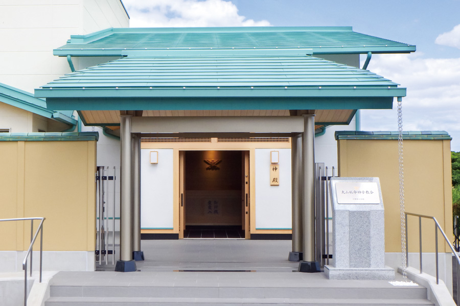 沖縄偉光会館には、県内各地から信者が駆け付けました。真新しい神の館を仰ぎ見て、「まだ夢のよう…」と放心状態の人も。各人が深々と頭を下げ、神門をくぐりました。