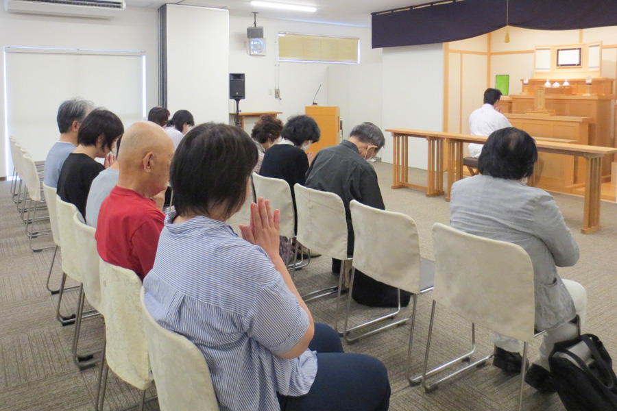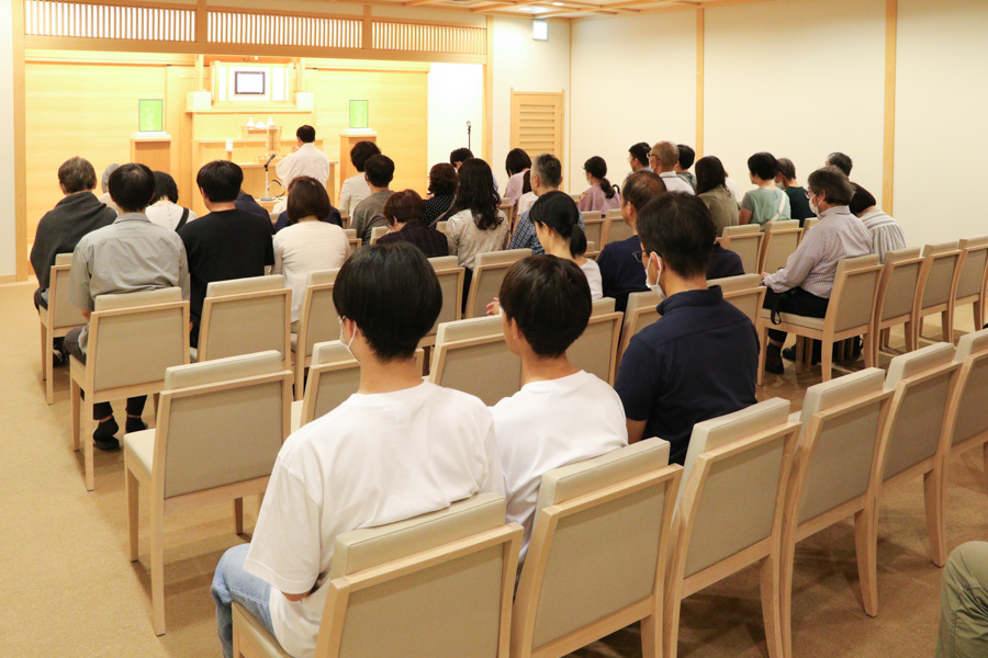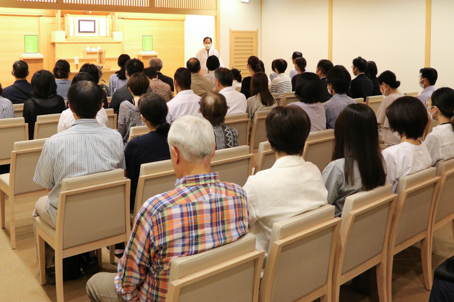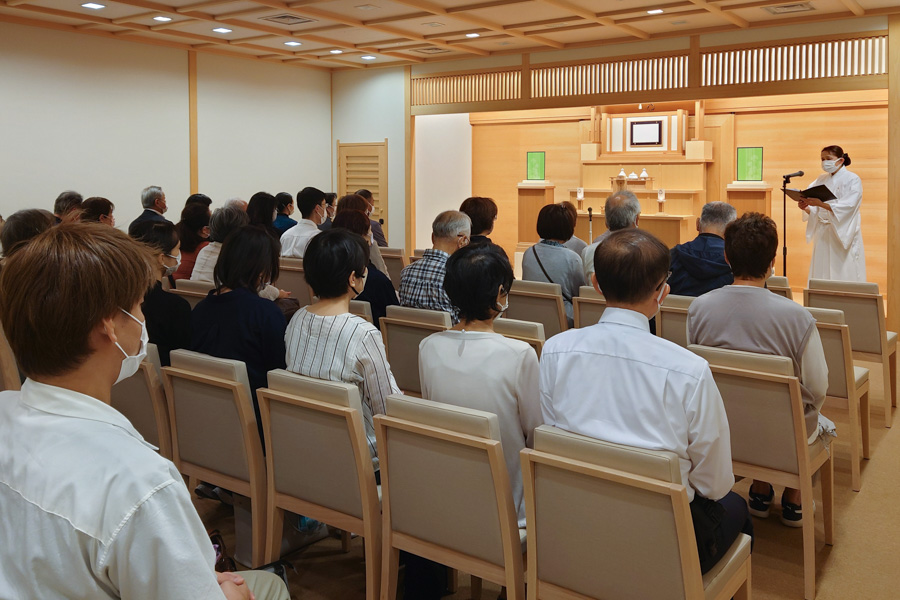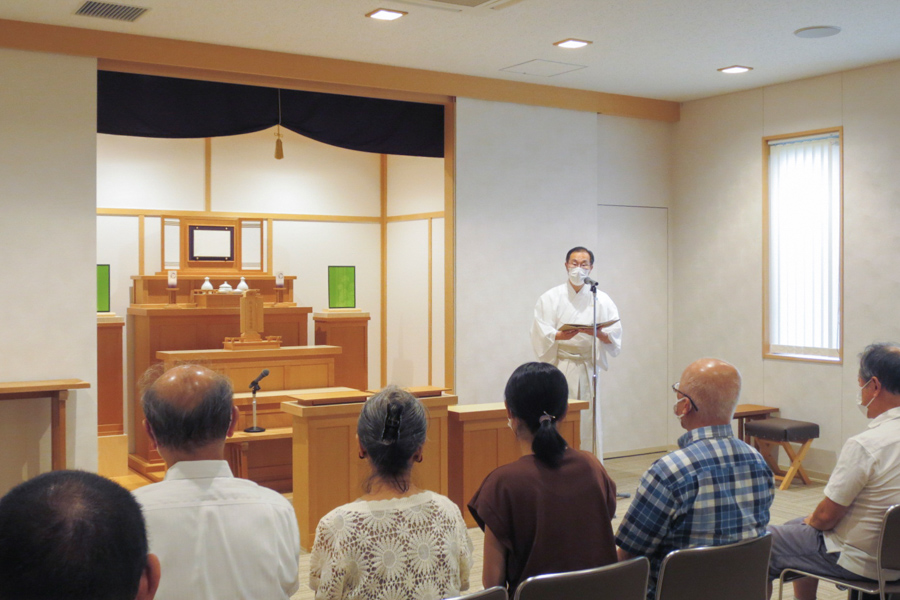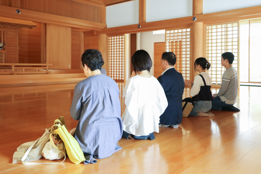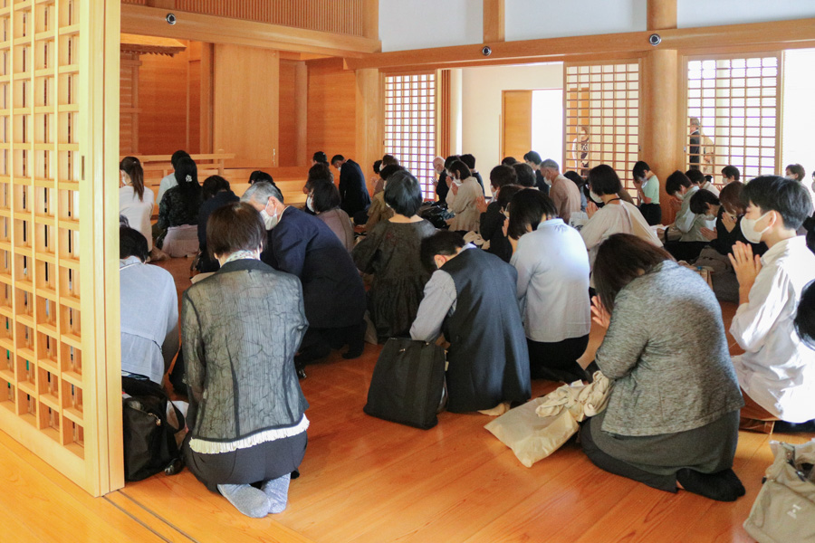 開式に当たり、伝導師が神示を基に「先祖供養」の心を確認。「家族、縁者と共に過ごしてこられた『心の姿』はいかがでしょうか」「先祖供養は、形ではありません。神の教えを学んで豊かな心を育み、調和して生きる家族の姿を届けることです」。一人一人がうなずき、真剣な面持ちで耳を傾けます。