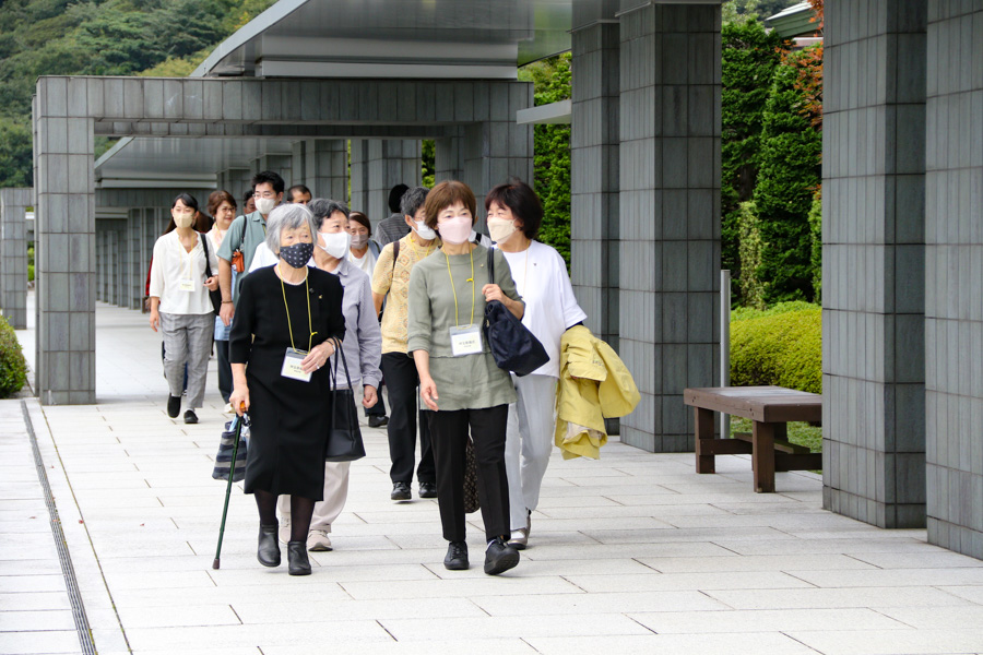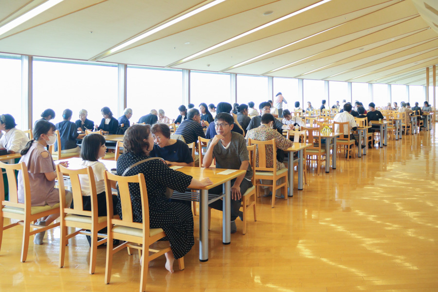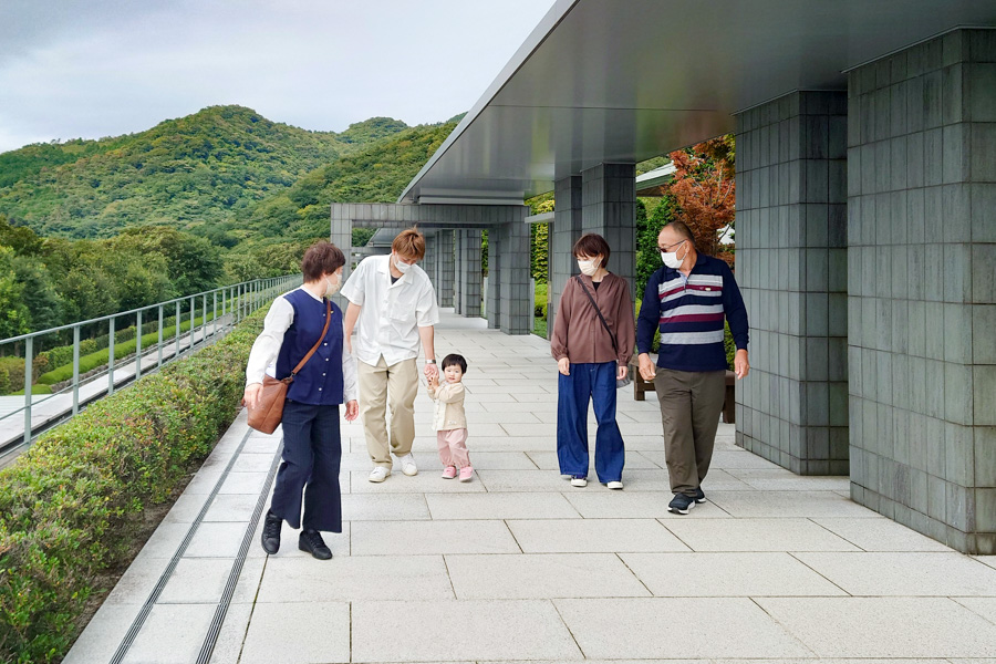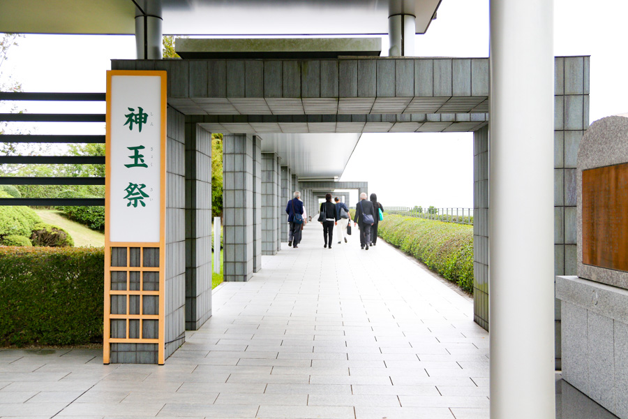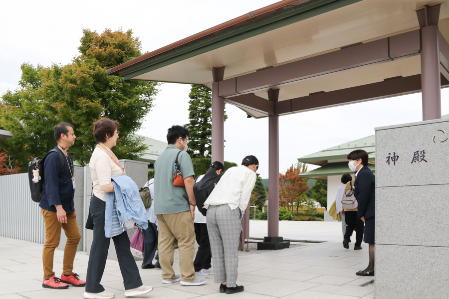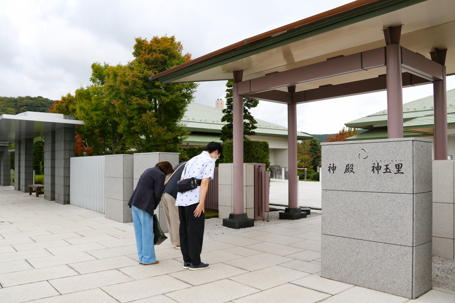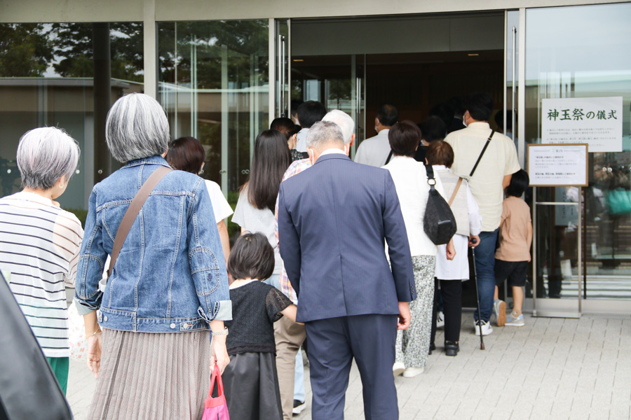 光寿信者参拝時は、心を磨いて、仕合せを手にする姿を故人・先祖に伝え、安心感をお届けする「神玉祭」の期間でもあります。併せて、偉光郷の神玉里、偉光会館の神玉園に納玉(納骨)している人を対象に、それぞれの場所で「神玉祭」の儀式を実施。大切な故人・先祖に、家族が仲良く暮らす姿を報告しようと、多くの人が神の館に足を運んでいます。
