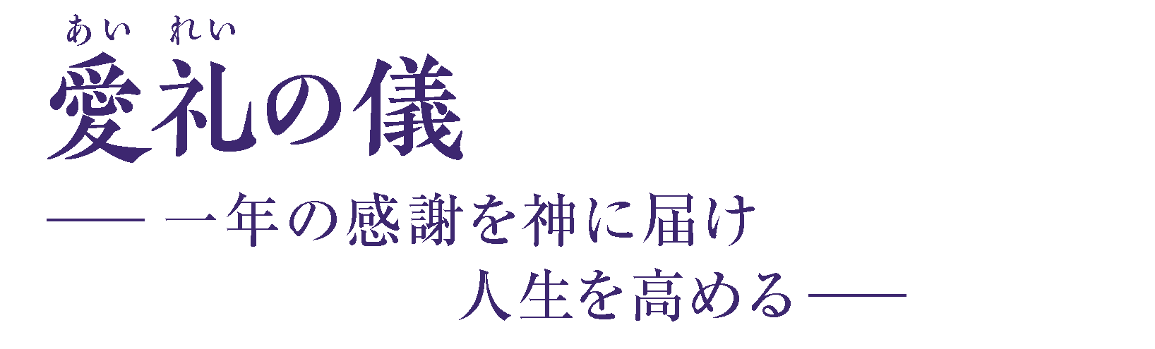 毎年、1月から8月まで、その年の指針に沿って神の教えの実践に努めれば、必ず大きな奇跡、救いを味わえます。一年の心の成長と、ご守護いただいたことへの感謝の思いを「御礼御祈願書」に記し、光寿信者参拝時期間中(9月23日~11月15日)に提出すると、教主正使者供丸光先生が神につないでくださいます。そこに重ねて、「愛礼の儀」で直接神に感謝を届けるところに、年々人生が高く引き上げられていきます。