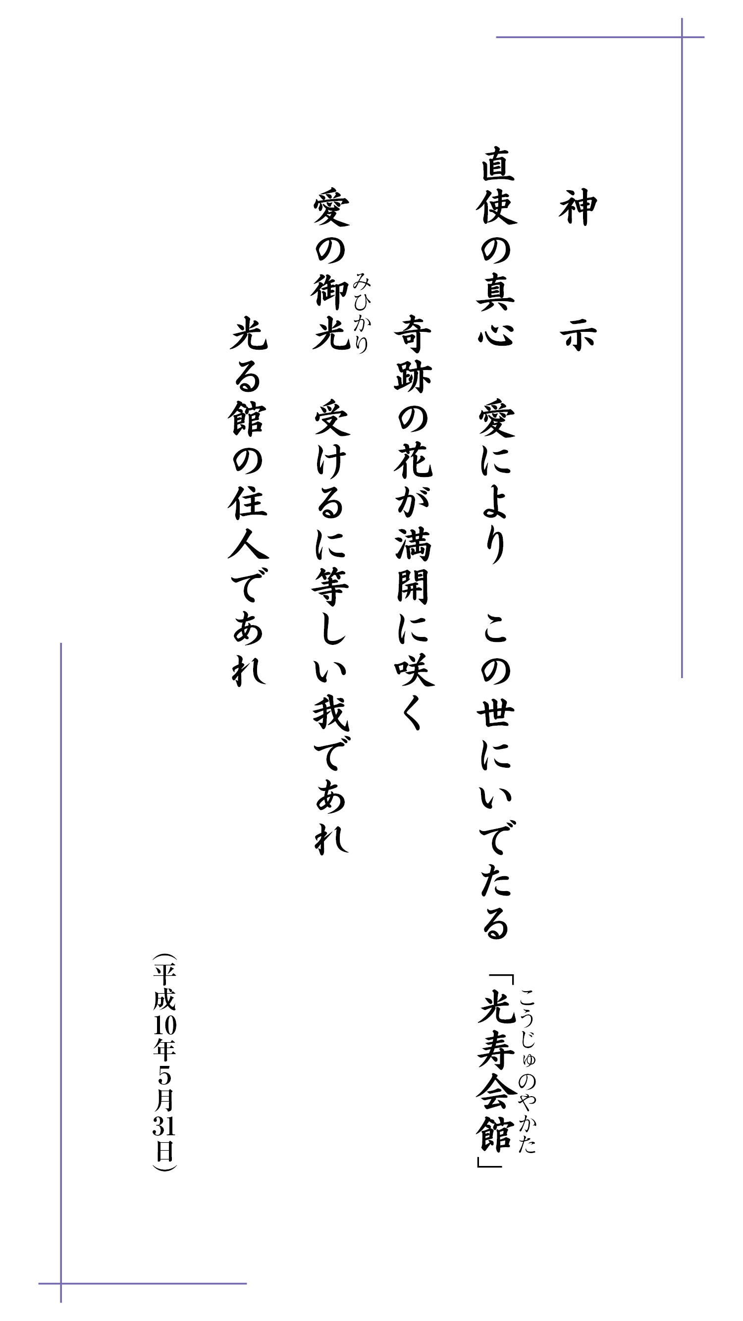 ・光色は、それぞれの存在が光る色。人の仕合せのために尽くせば、子孫へと受け継ぐ良き因、輝光(ひかり)が残ります。