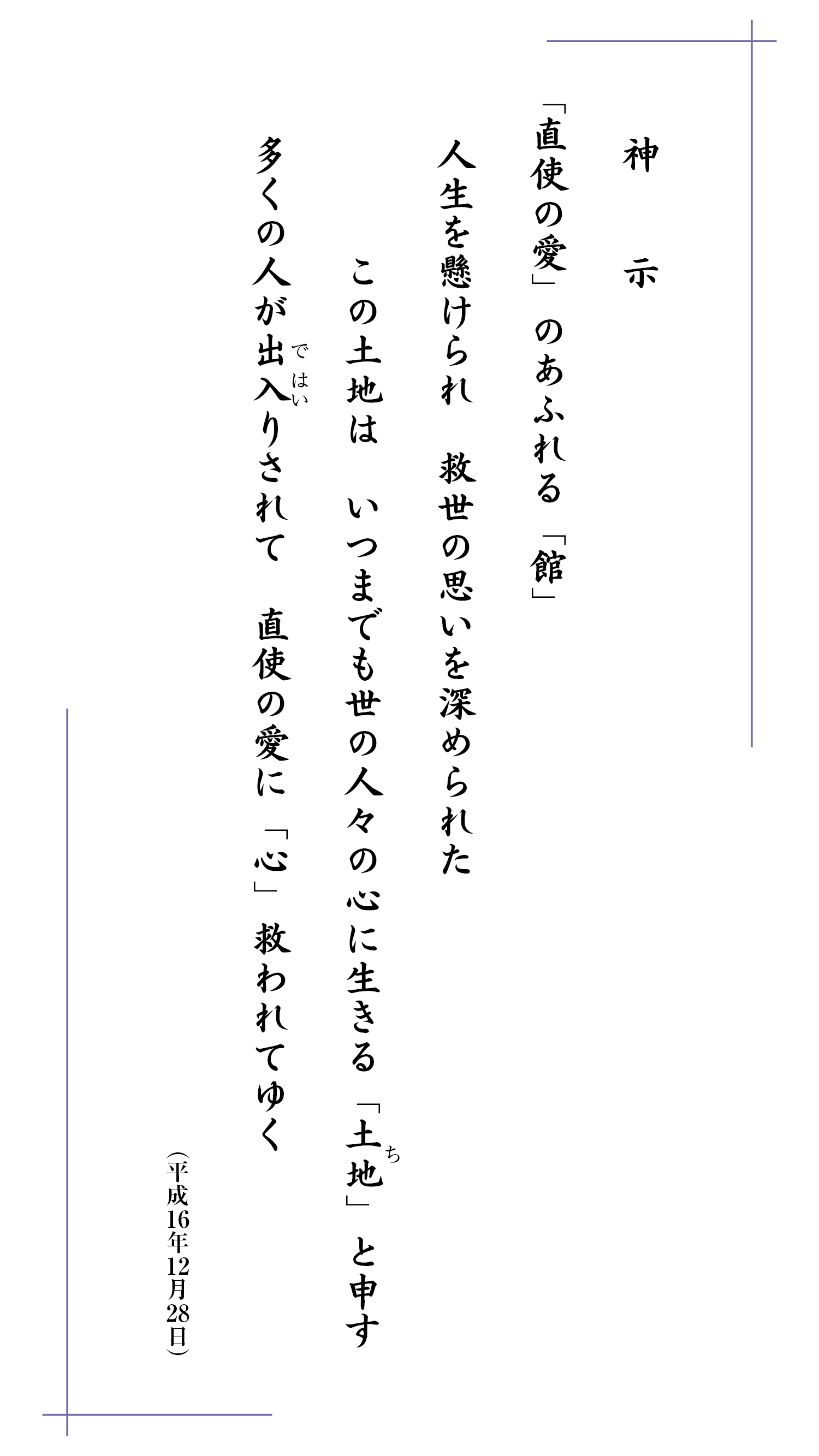 神の御魂が宿された、大山命の直々の使者、供丸姫先生が生誕し、救世・愛の心を育まれた地に立つ会館です。ここには、直使の御心、愛があふれ、供丸姫先生が願われたとおり、人の心に希望を与え、仕合せ、幸福へと導いていく力があります。