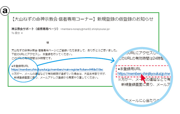 「【大山ねずの命神示教会 信者専用エリア】新規登録の仮登録のお知らせ」のメッセージを開き、本登録用URLを24時間以内にクリック